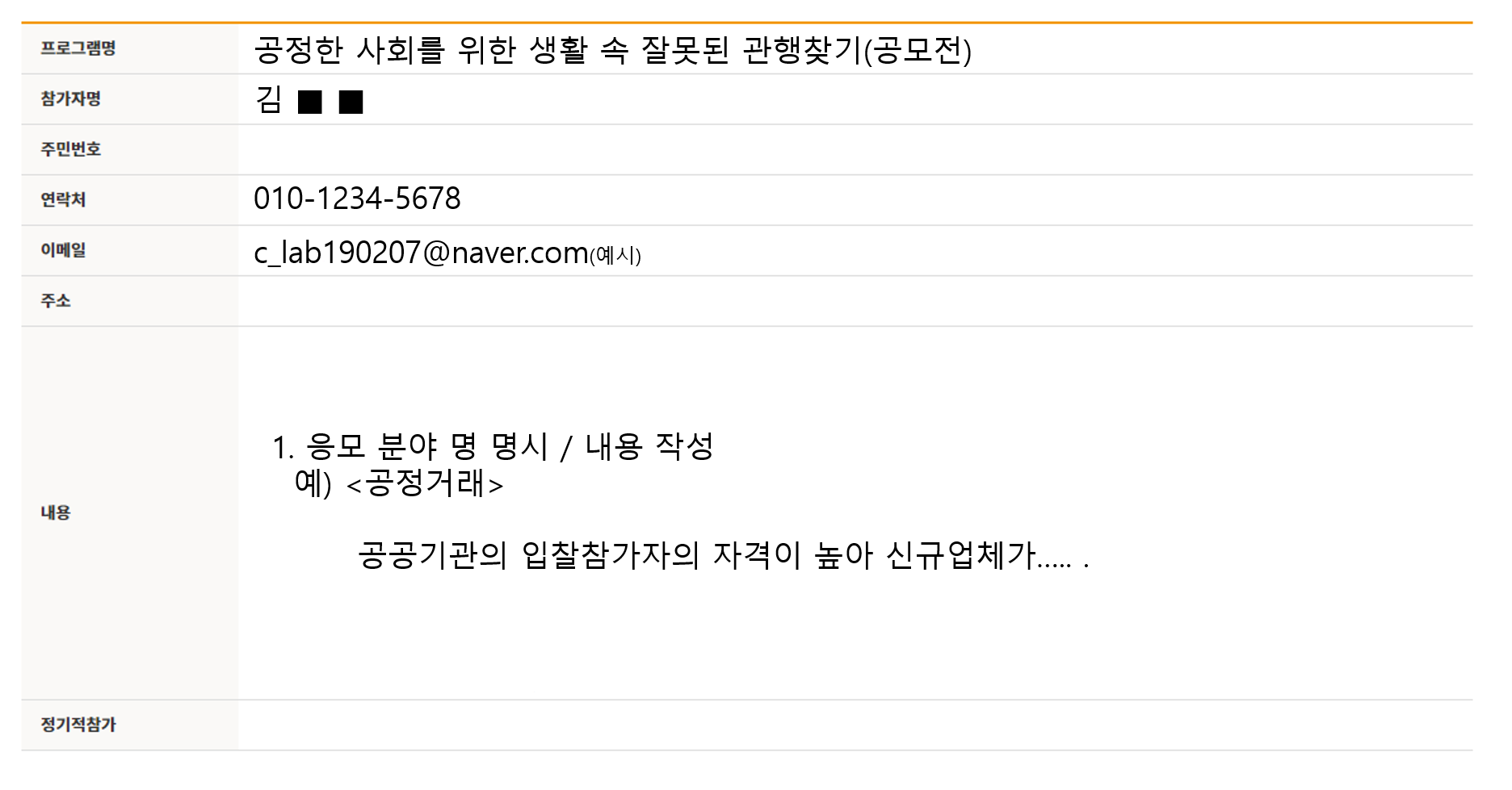 공정사회 구현을 위해 일반 시민이 경험했던 생활 속 불합리한 관행을 찾아 이를 개선해 나가고자 시행하는 캠페인입니다.