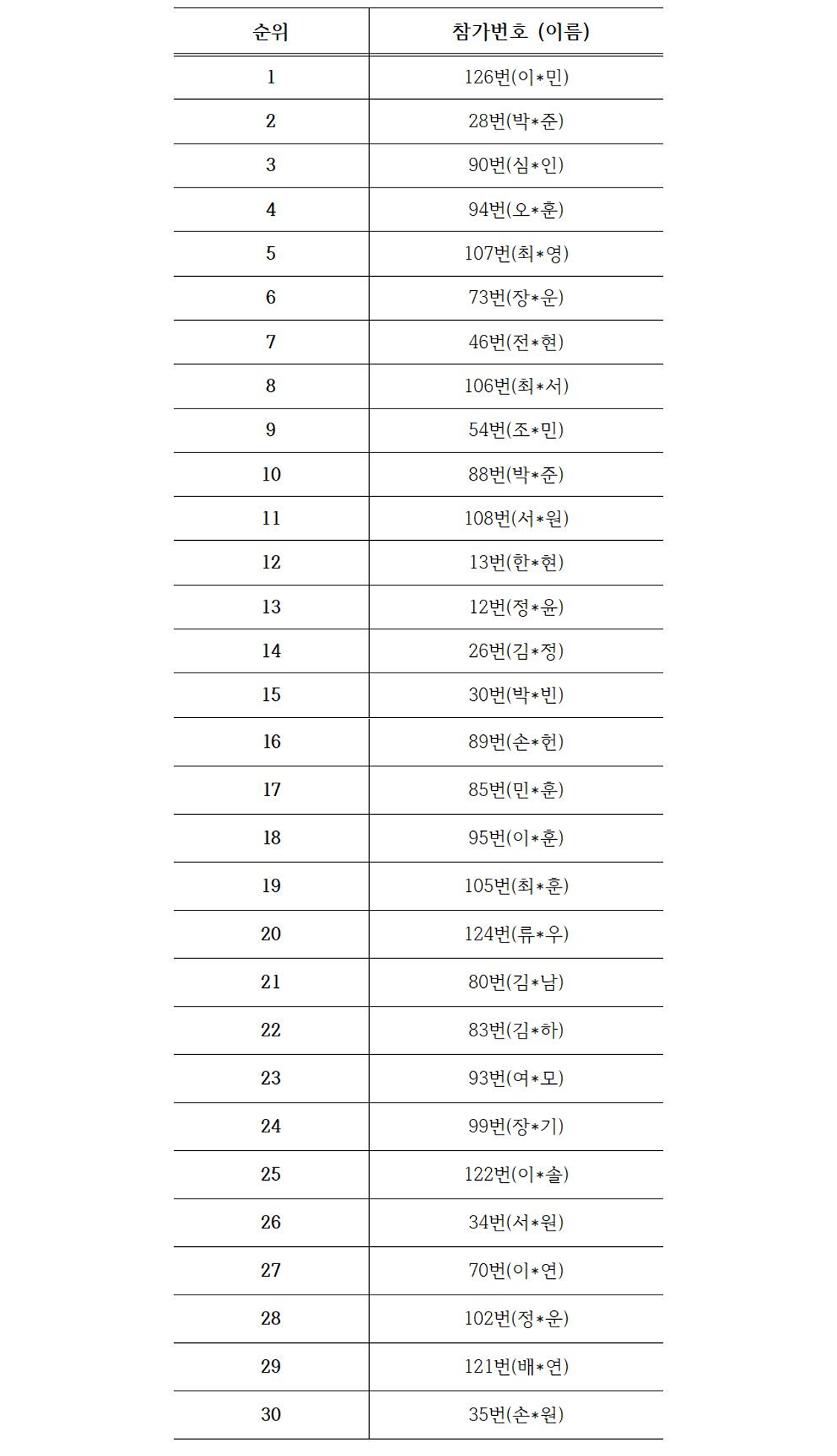 ※ 위 본선진출자는 심사위원 5인 중 4인의 총점을 백분율로 나타내어 선정된 결과입니다. (심사위원 1인의 점수는 현재 진주관내 초등학교에 재직중이신 관계로 공정성을 위해 총점에 반영하지 않았습니다.)