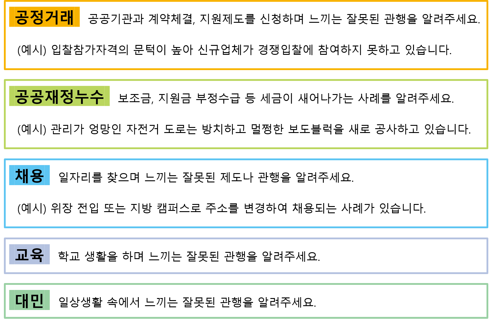 ■ 공모분야 : 공정거래, 공공재정누수, 채용, 교육, 대민 분야 중 1가지 분야를 선택하여 구체적인 사례 또는 관행을 서술해 주세요.